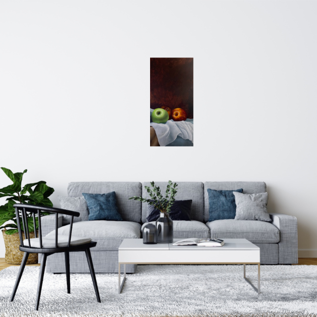 Peint dans le style des artistes anciens en utilisant des couches de glacis acrylique pour ajouter un éclat à la peau des fruits.